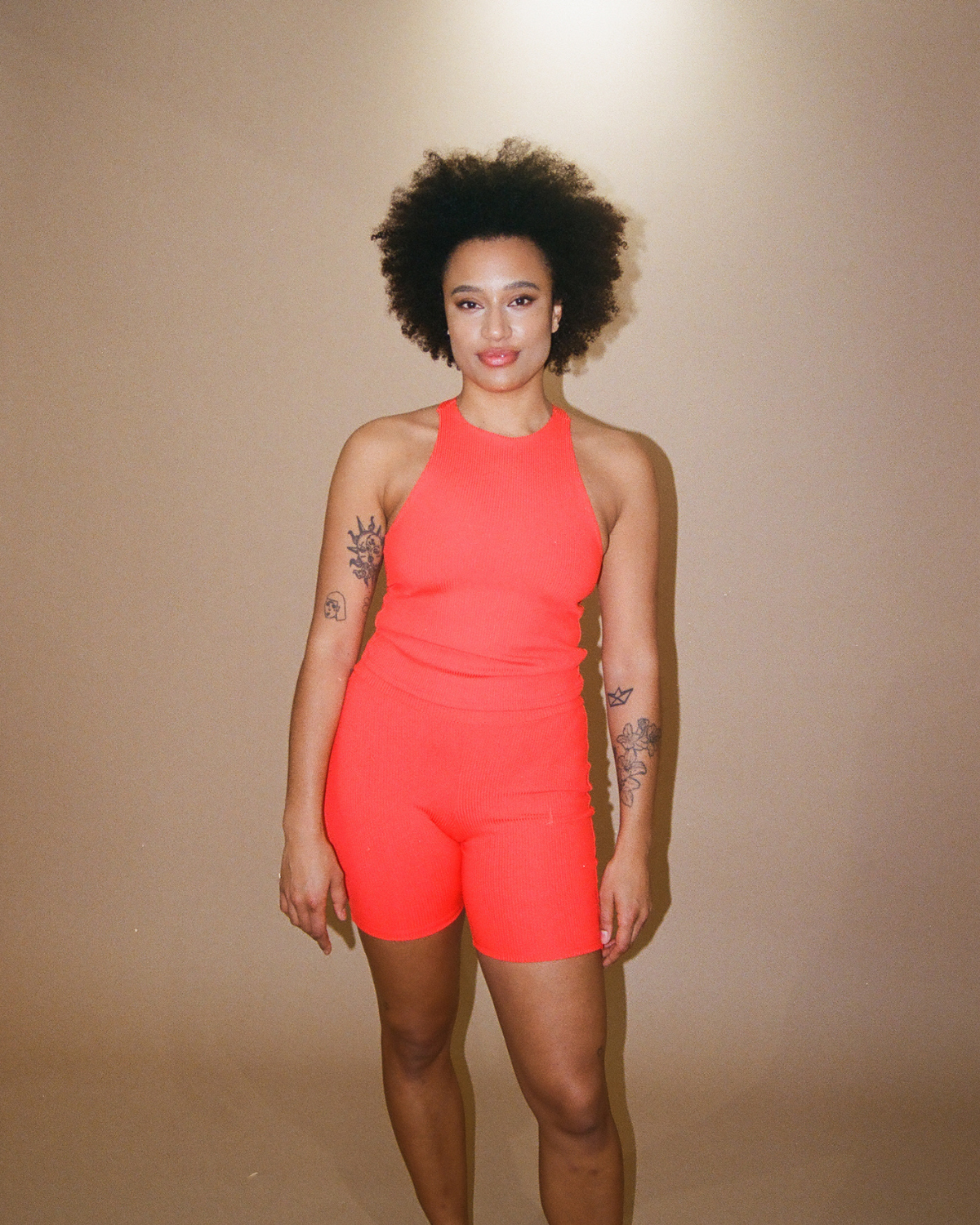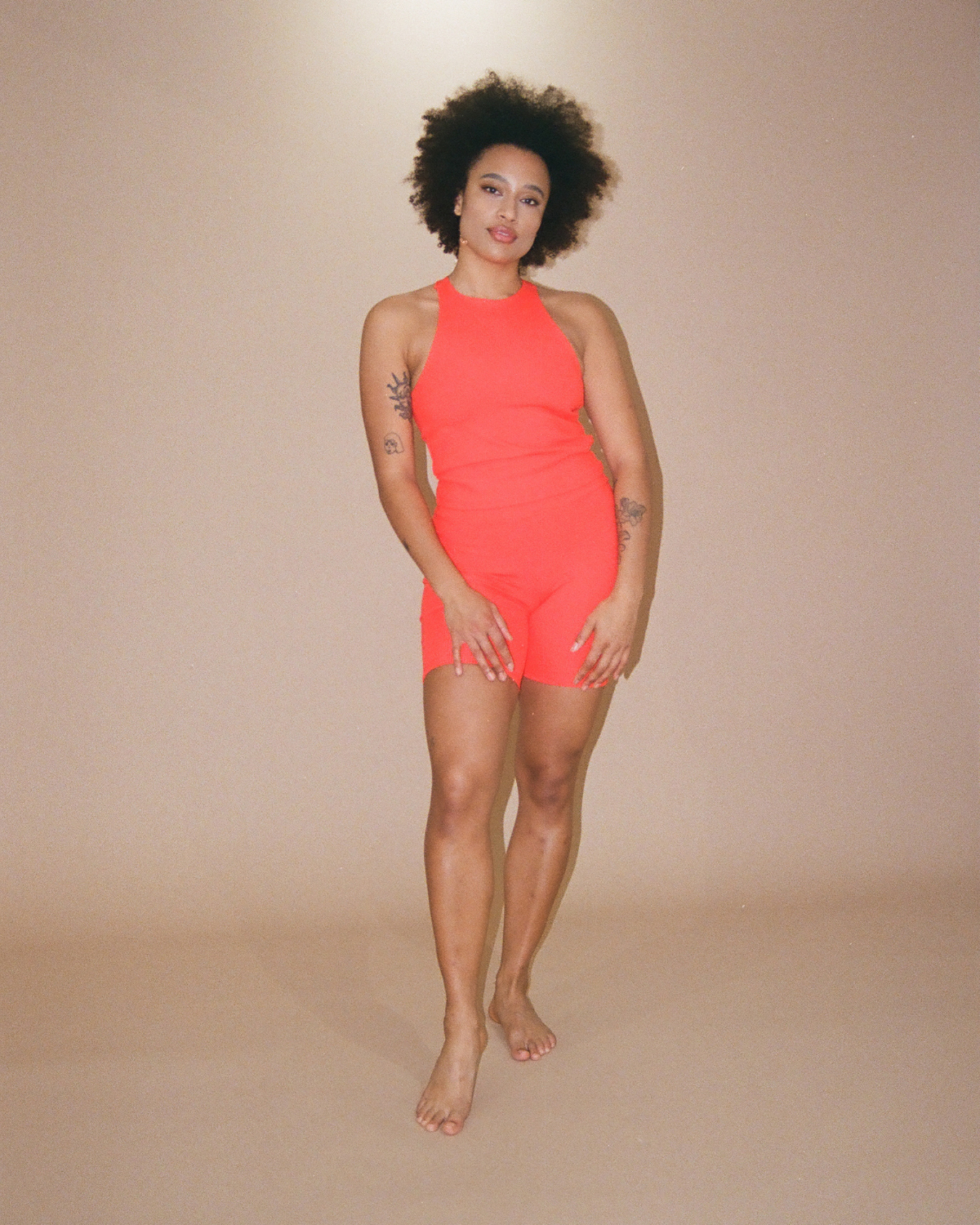 Gabriella porte Bicycle Race en Tomate Cerise en taille 2TG avec Primitive Love en Violet en taille 2TG. Pour plus de soutien, elle pourrait porter un TG dans le haut Primitive Love.