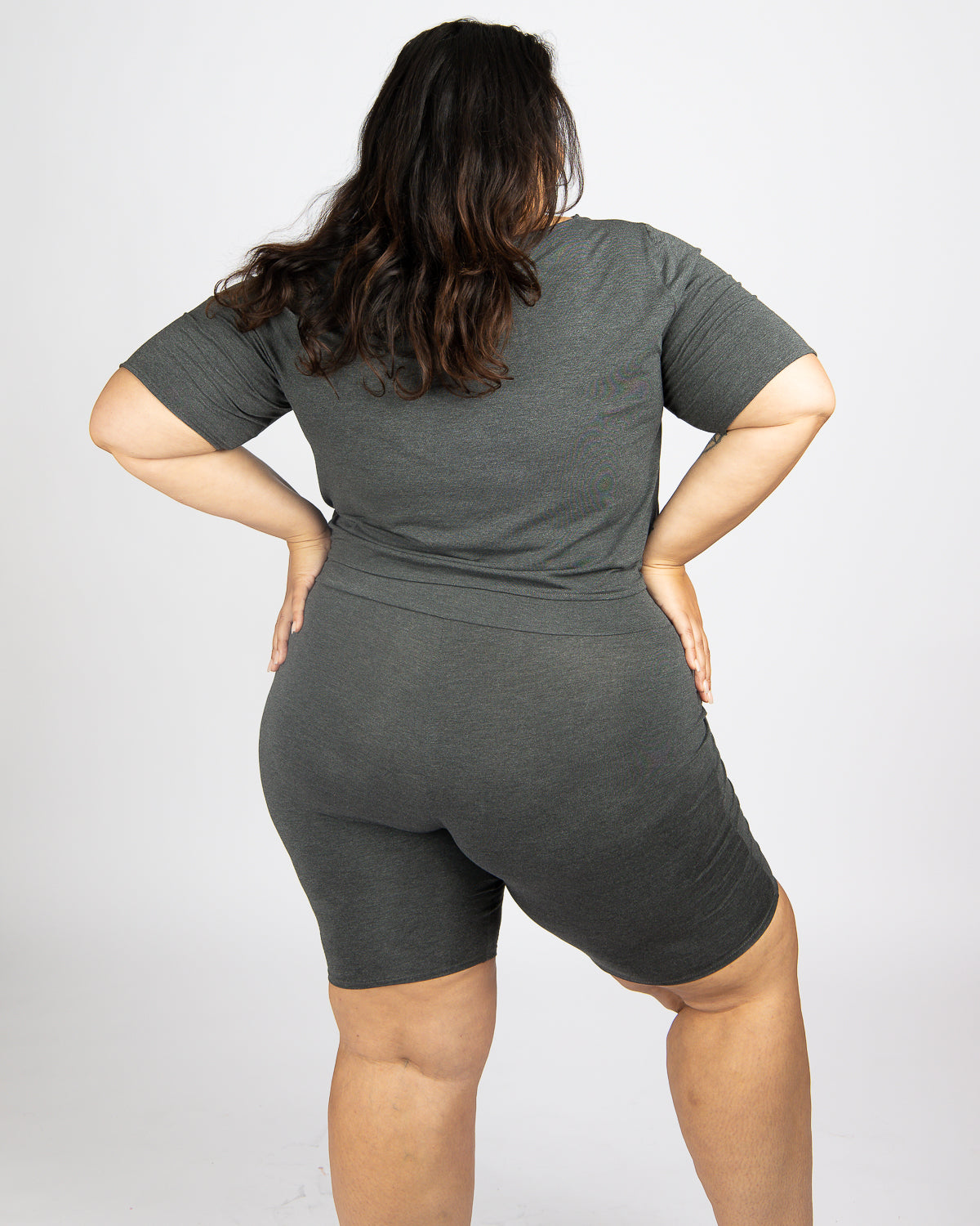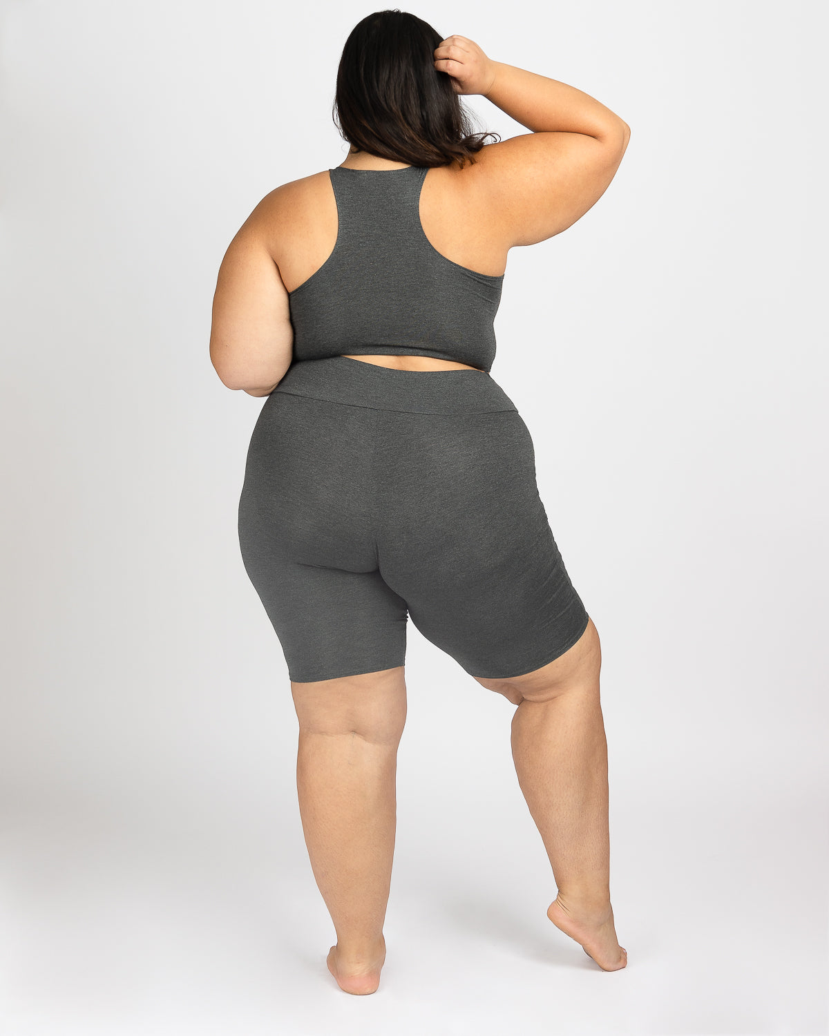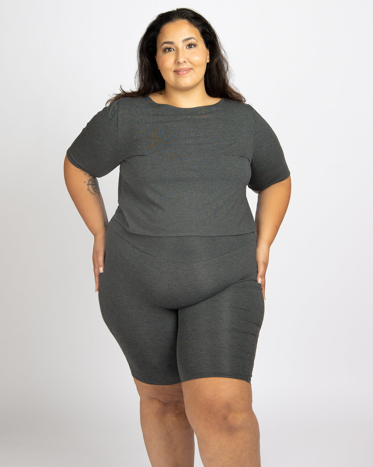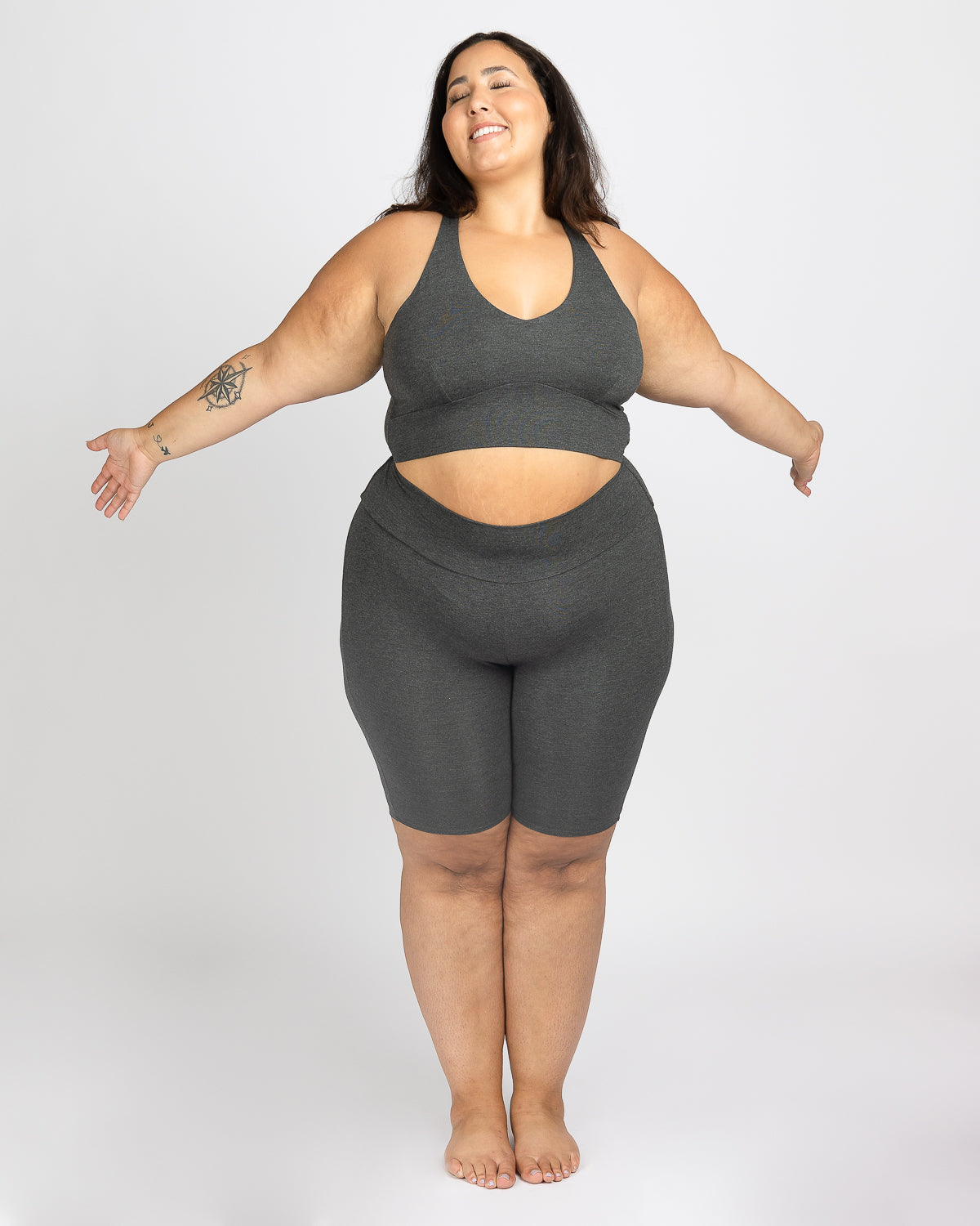Soraya mesure 5'7" et porte Cecilia Gris bruyère en 2T-Grand avec Bicycle Race Gris bruyère en 2T-Grand.