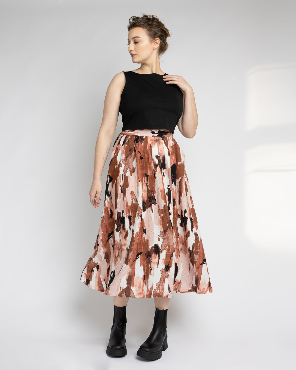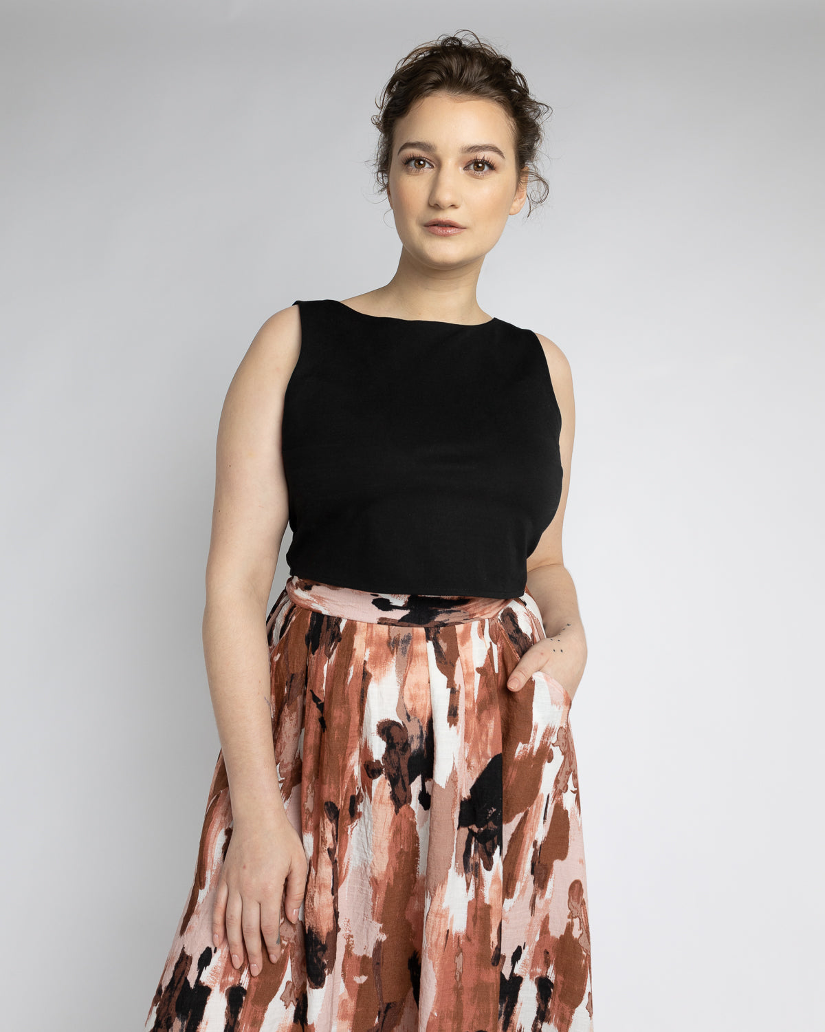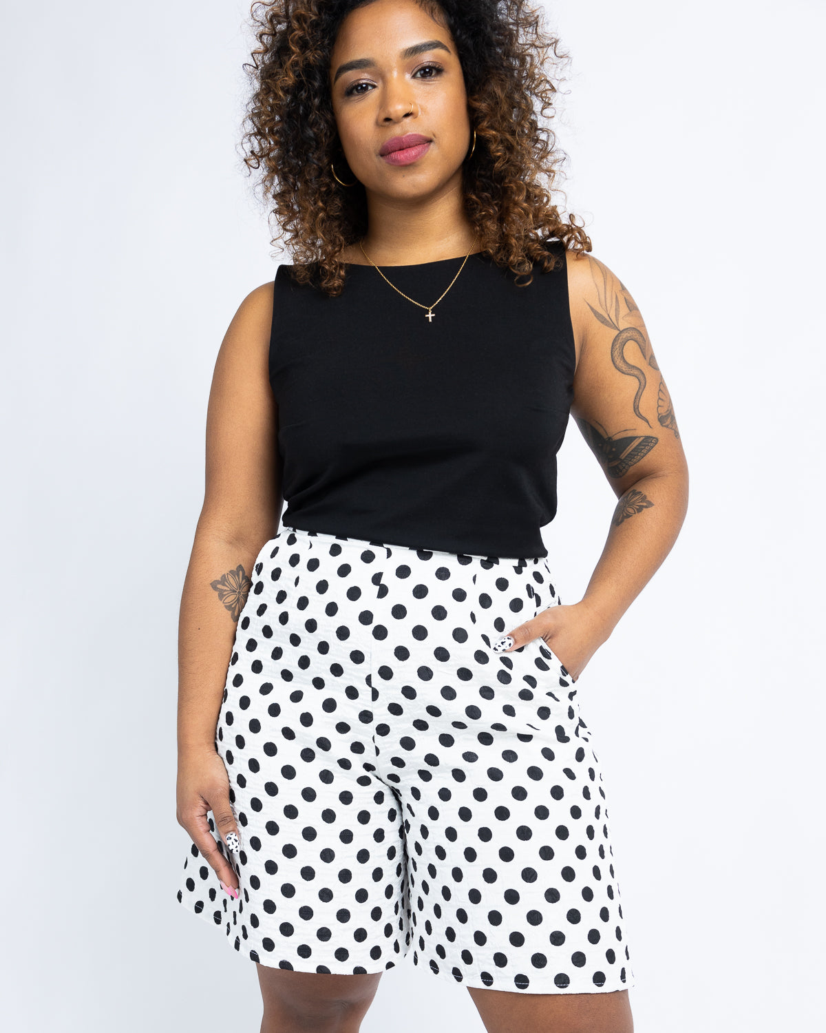 Élise mesure 5'2" et porte Detroit 442 Noir en taille 4 avec Big Lies Pois en taille 4.