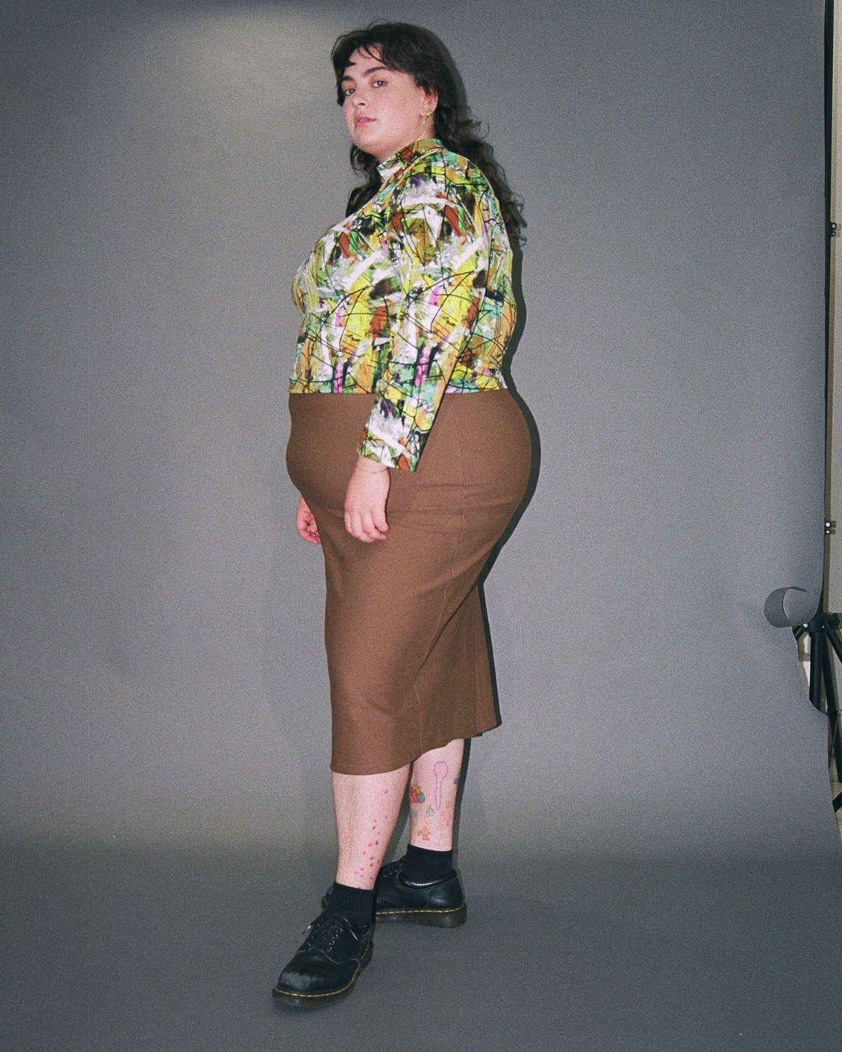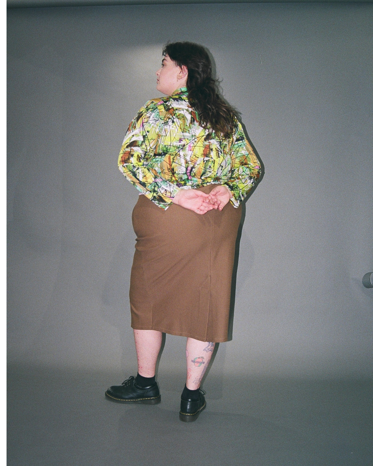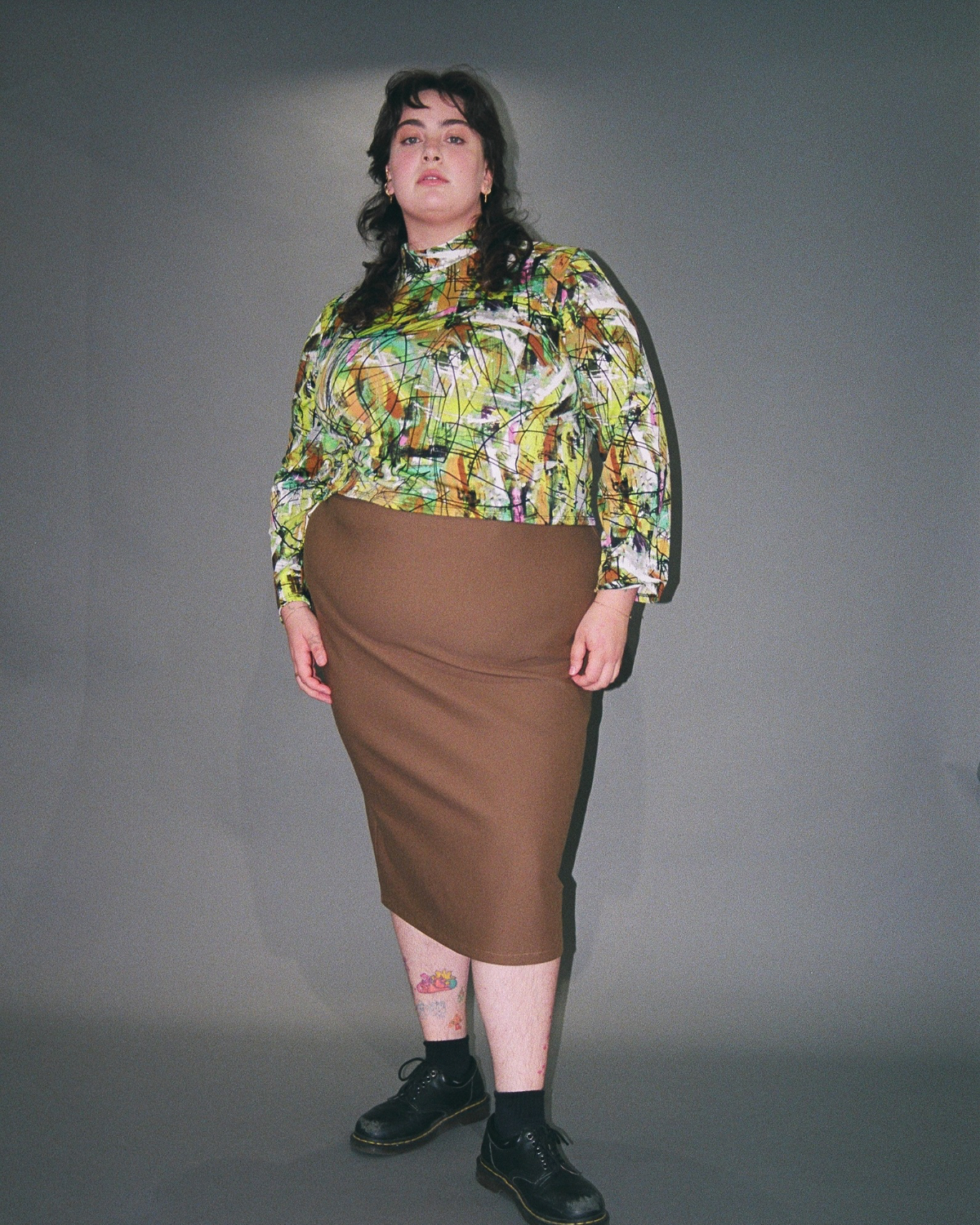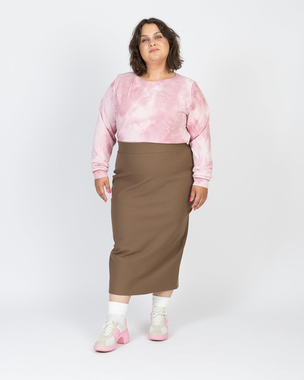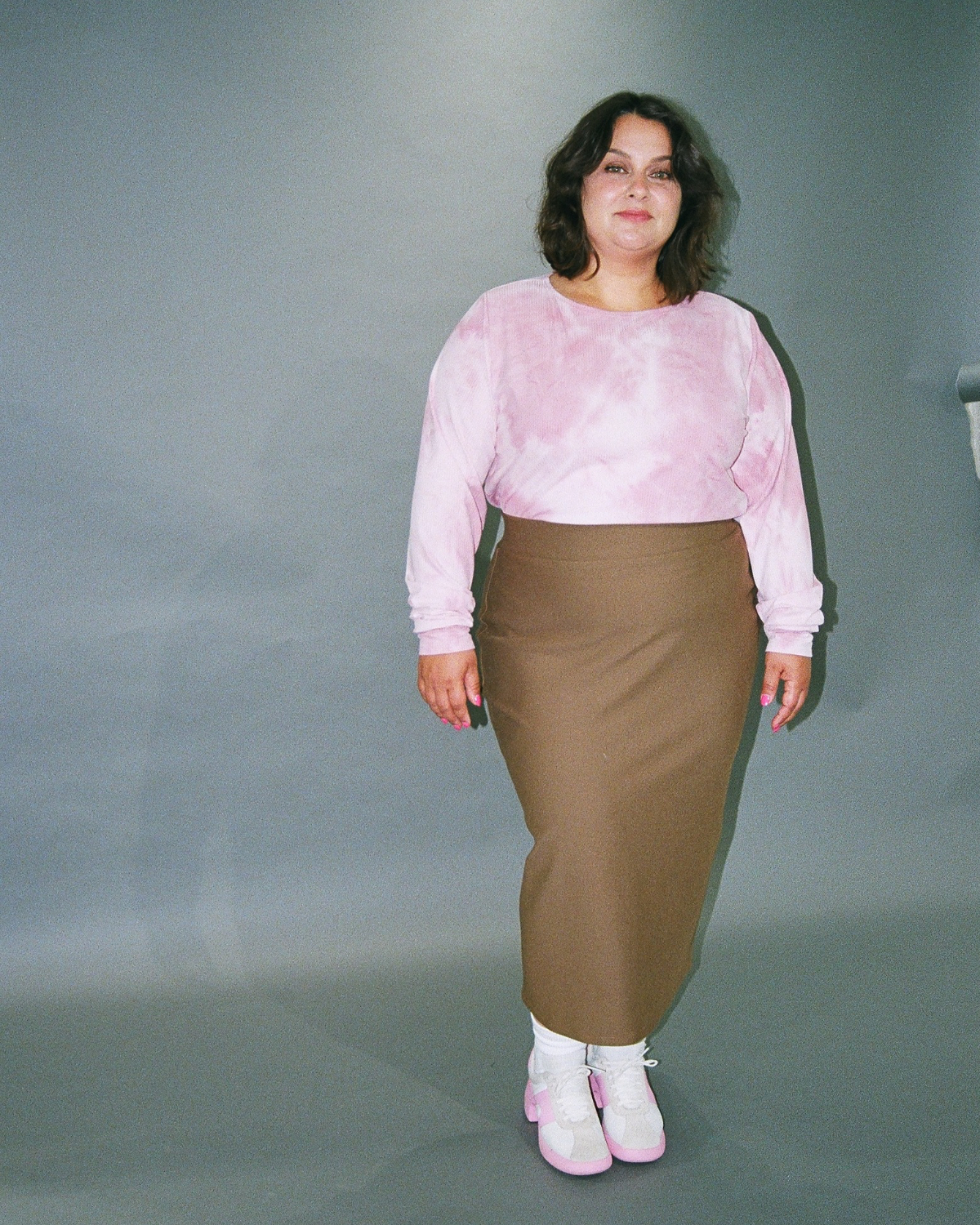 Yasmine porte Excuse me, Mr en Chameau en taille TG avec Come and Hold me en Rose dye en taille TG.