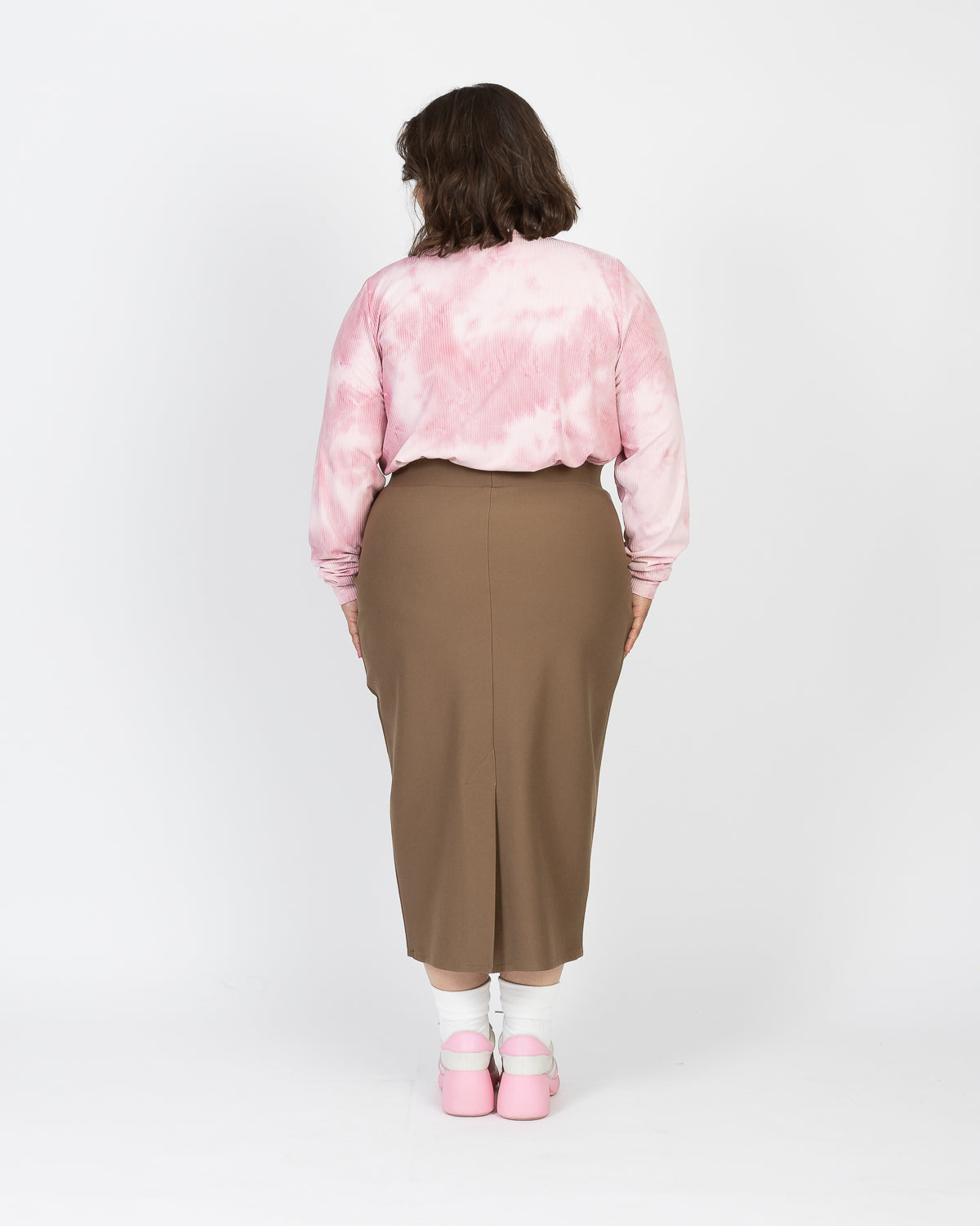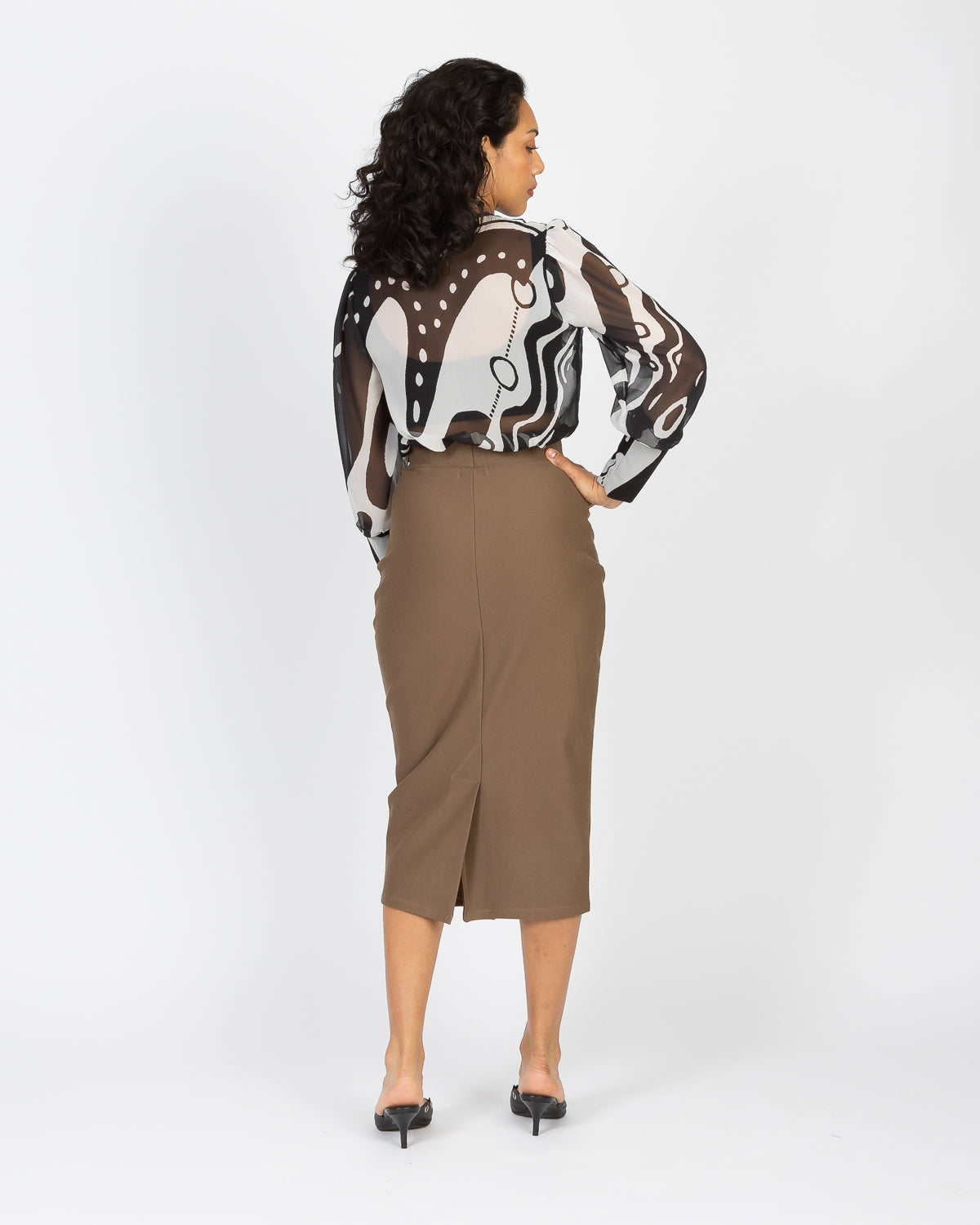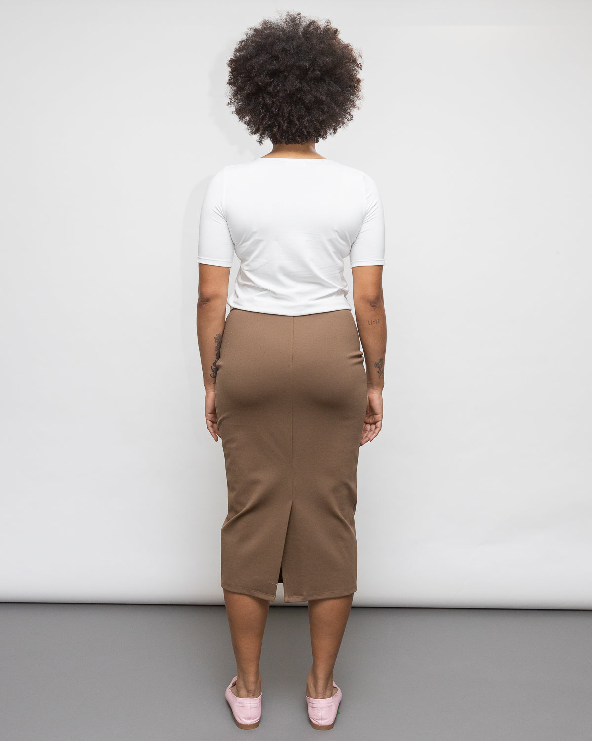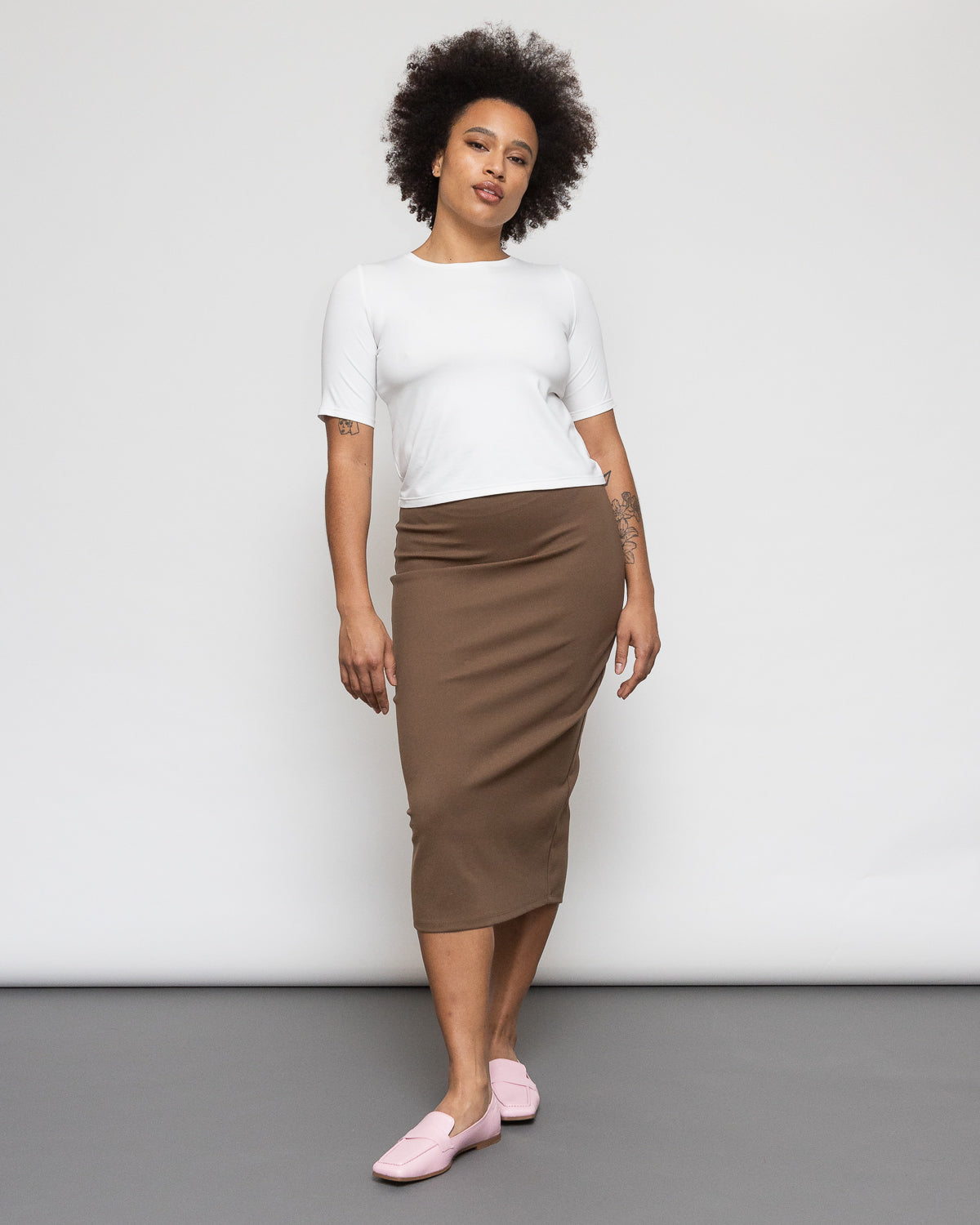 - Coupe classique de jupe crayon taille haute jusqu'aux genoux