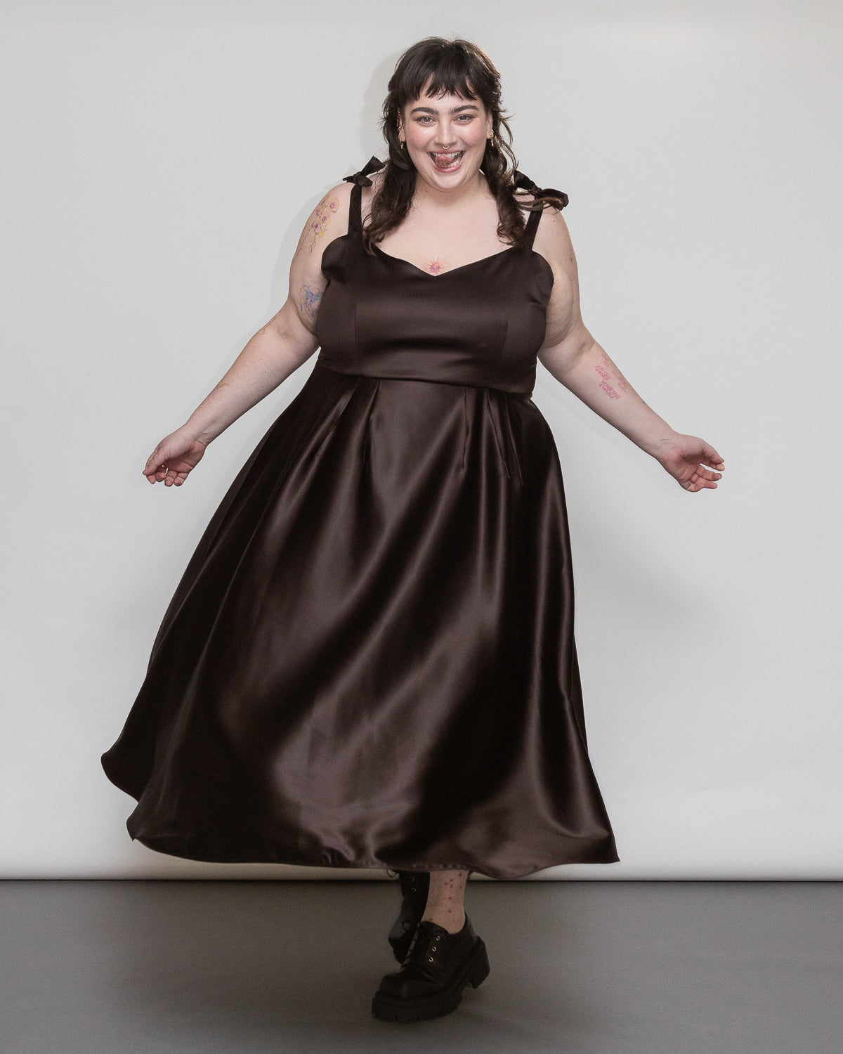 Stephanie porte Fantastic Voyage en satin marron en taille 4.