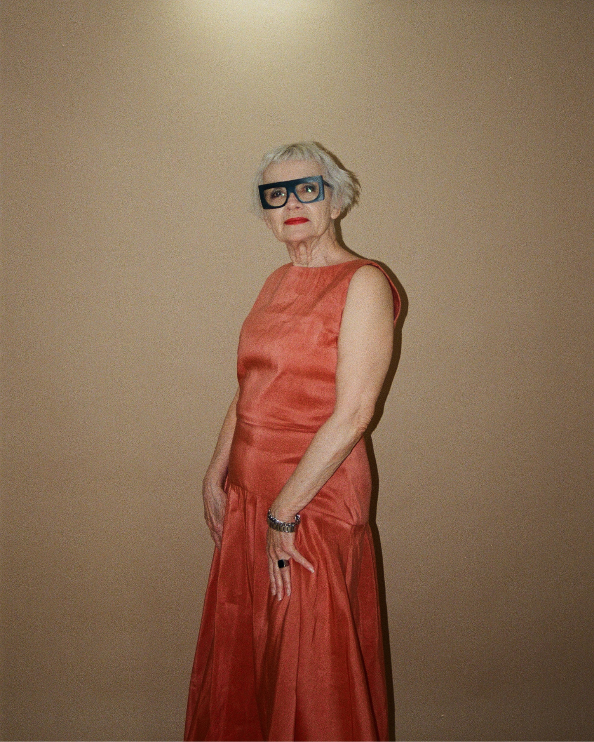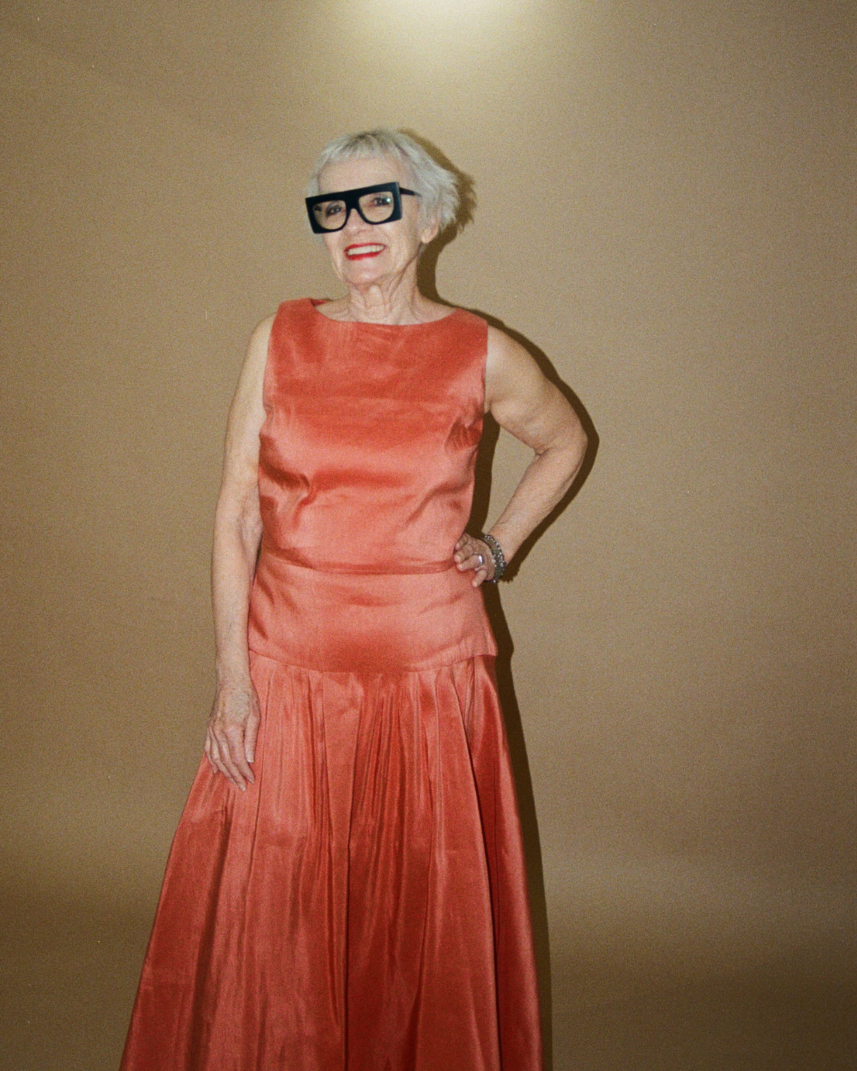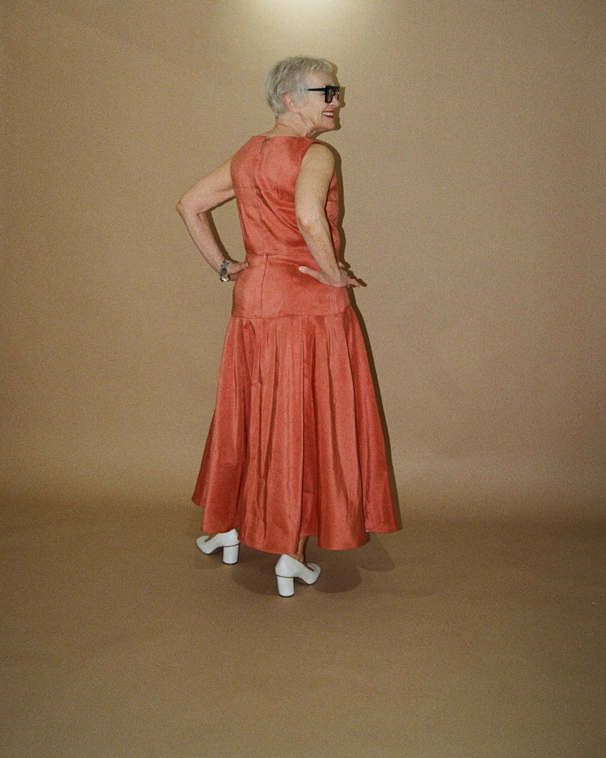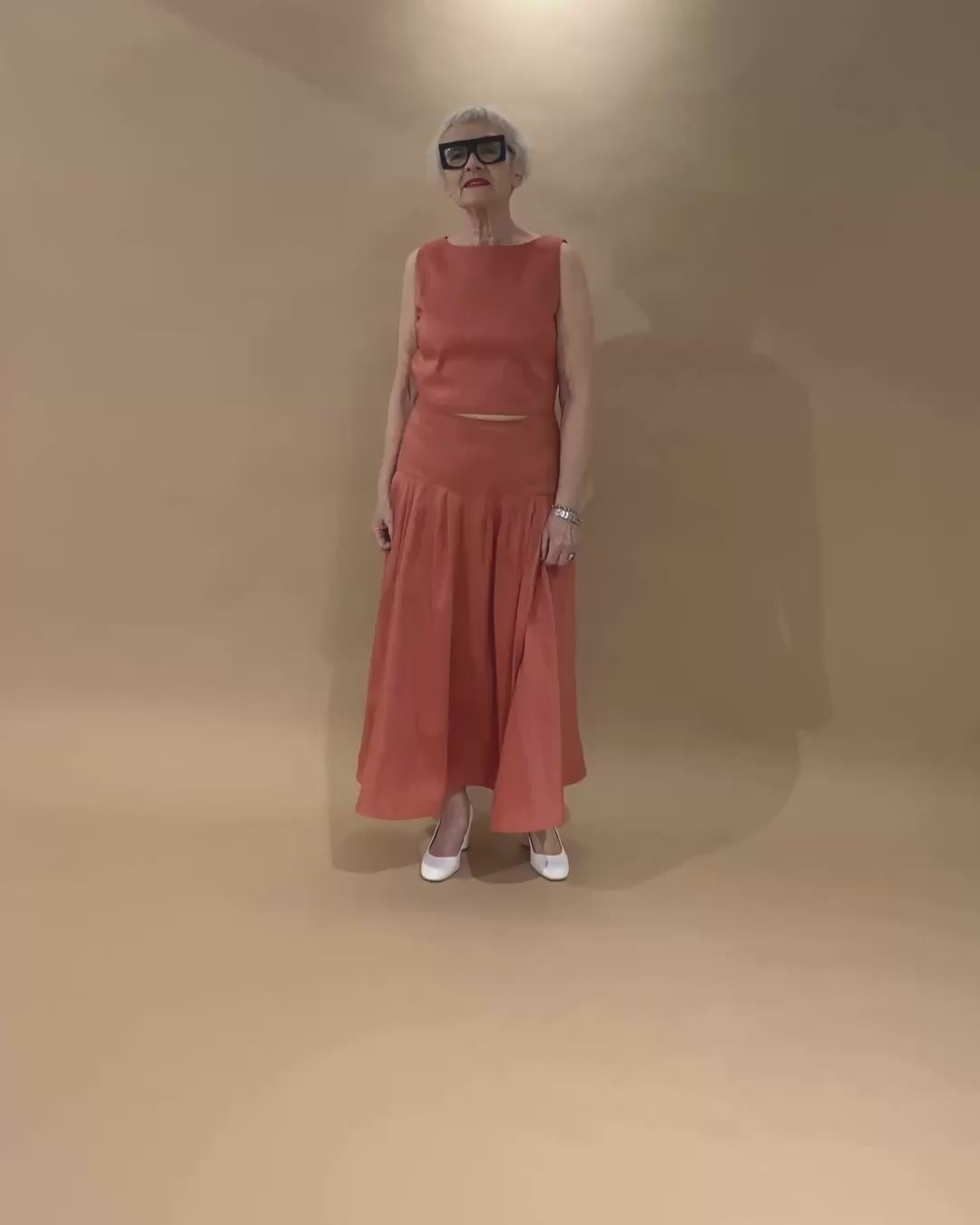 Patricia porte Jodi en taille M en Corail de soie avec Detroit 442 en Corail de soie en taille M.