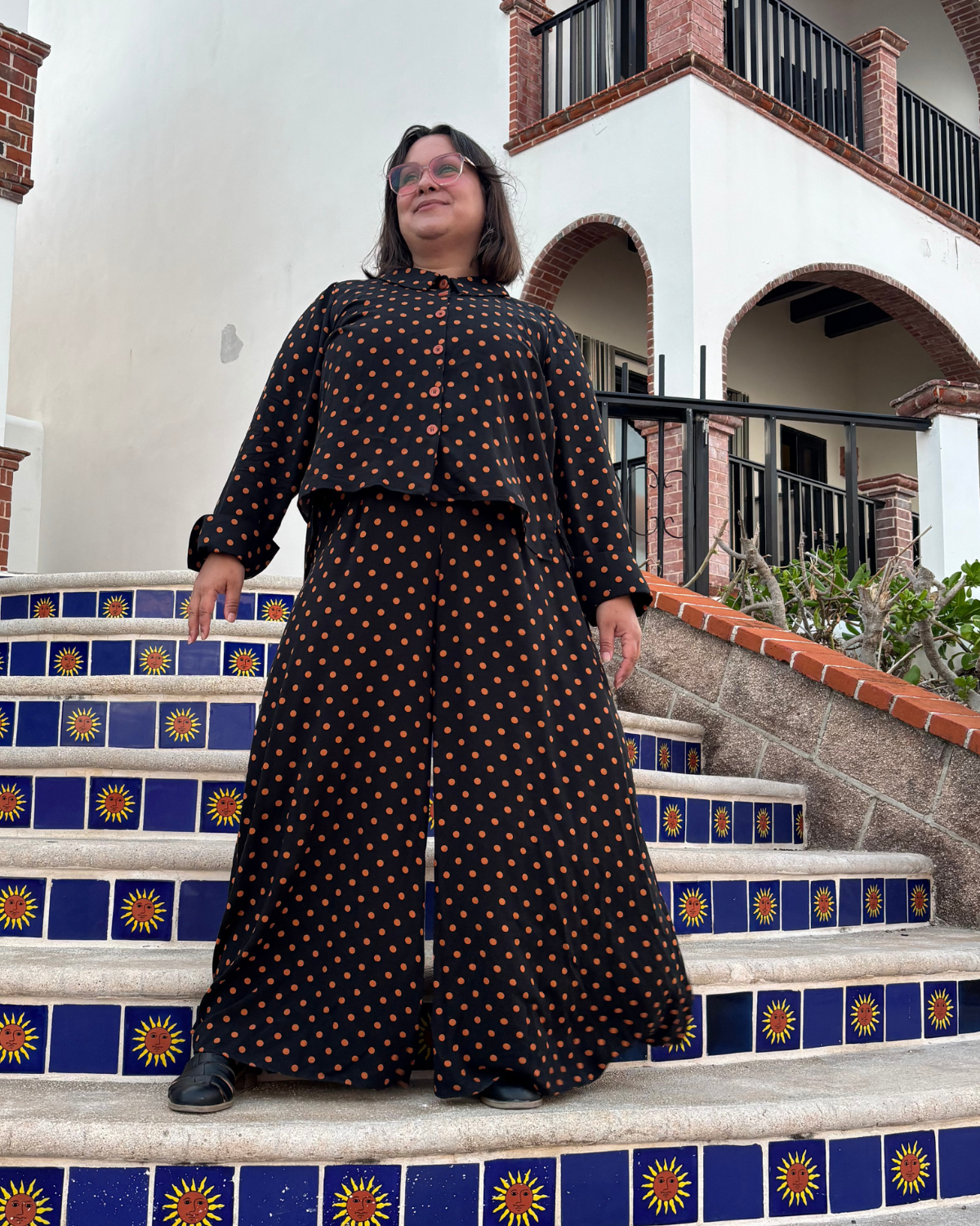 Marie fait 5.6 et porte la combinaison Maria Baila en TP et la blouse Get Back en TP