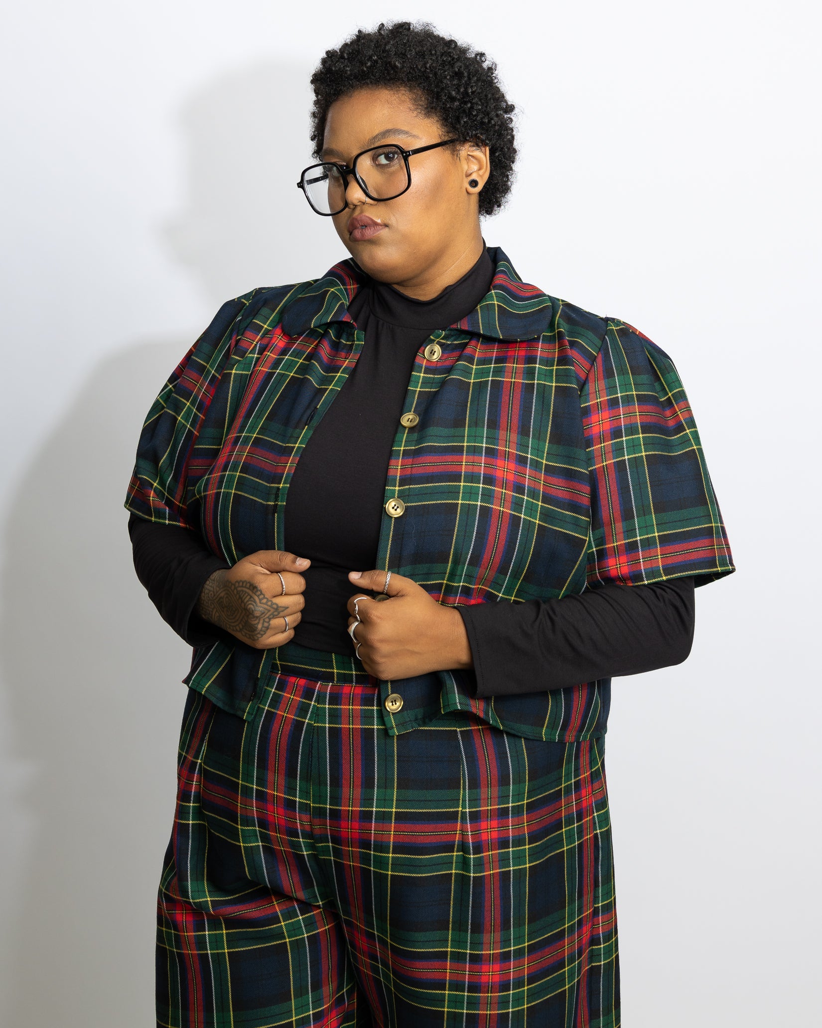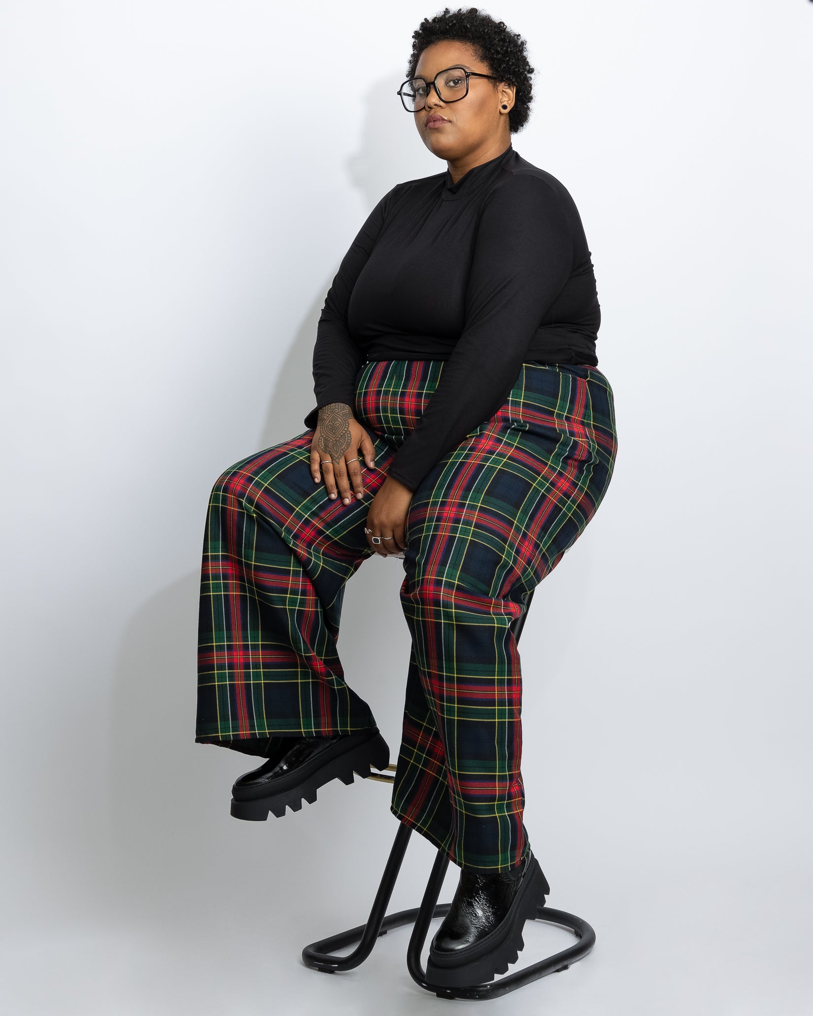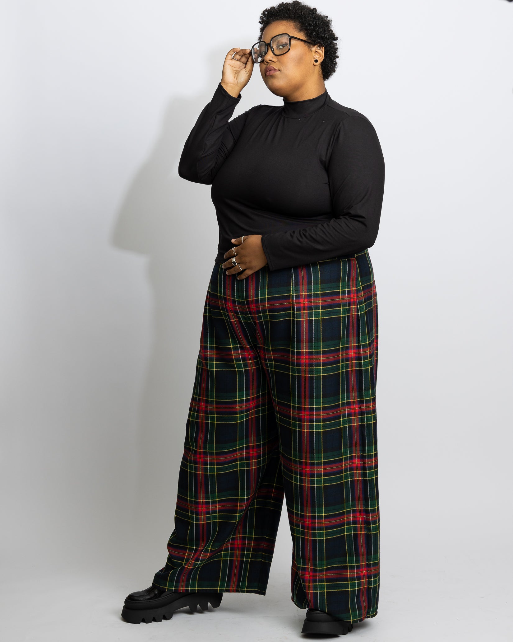 Lydia mesure 5'6" et porte Respect Plaid en taille 22 avec Nobody's Baby Plaid en 3T-Grand par-dessus Primitive Love 2.0 Noir en 3T-Grand.