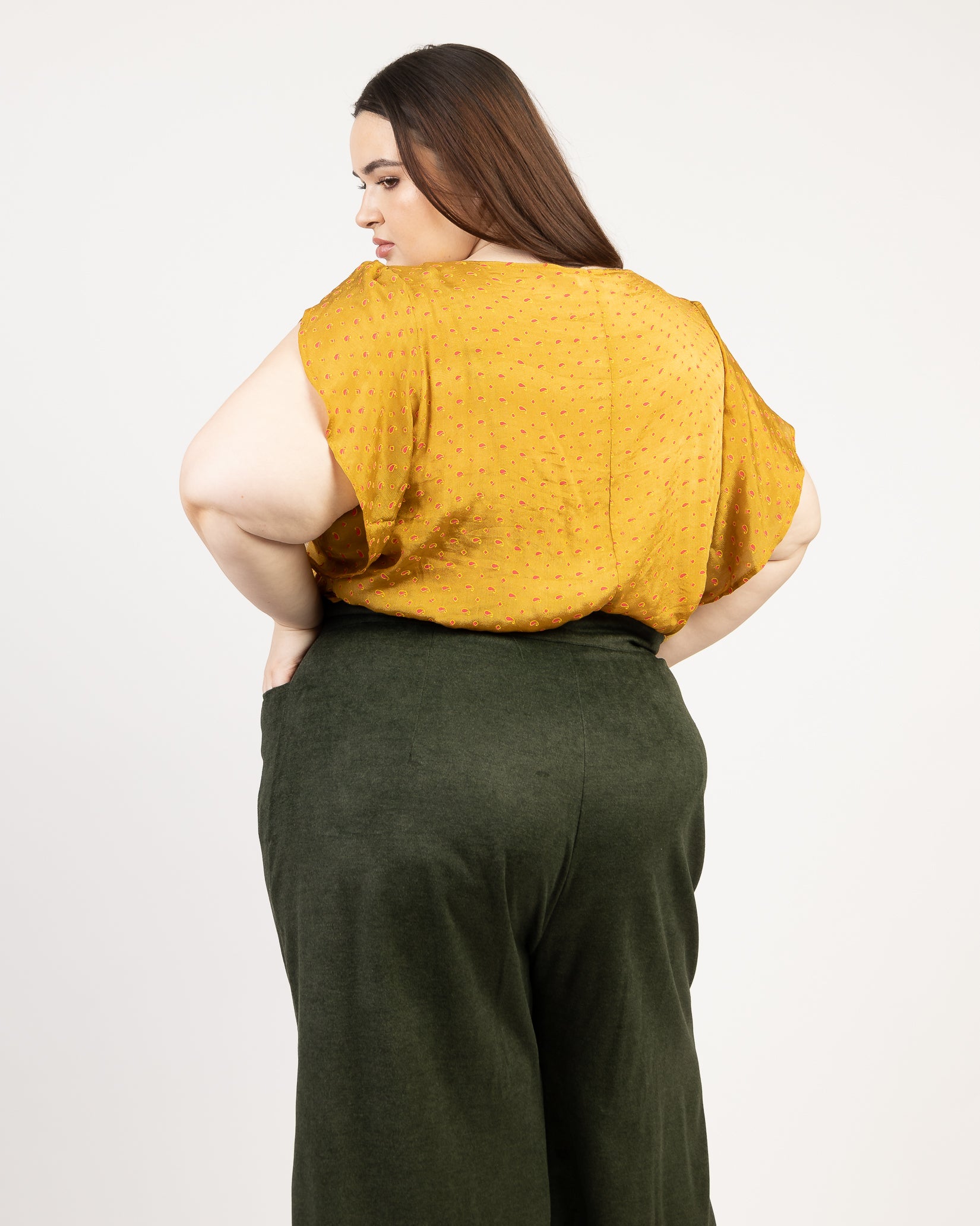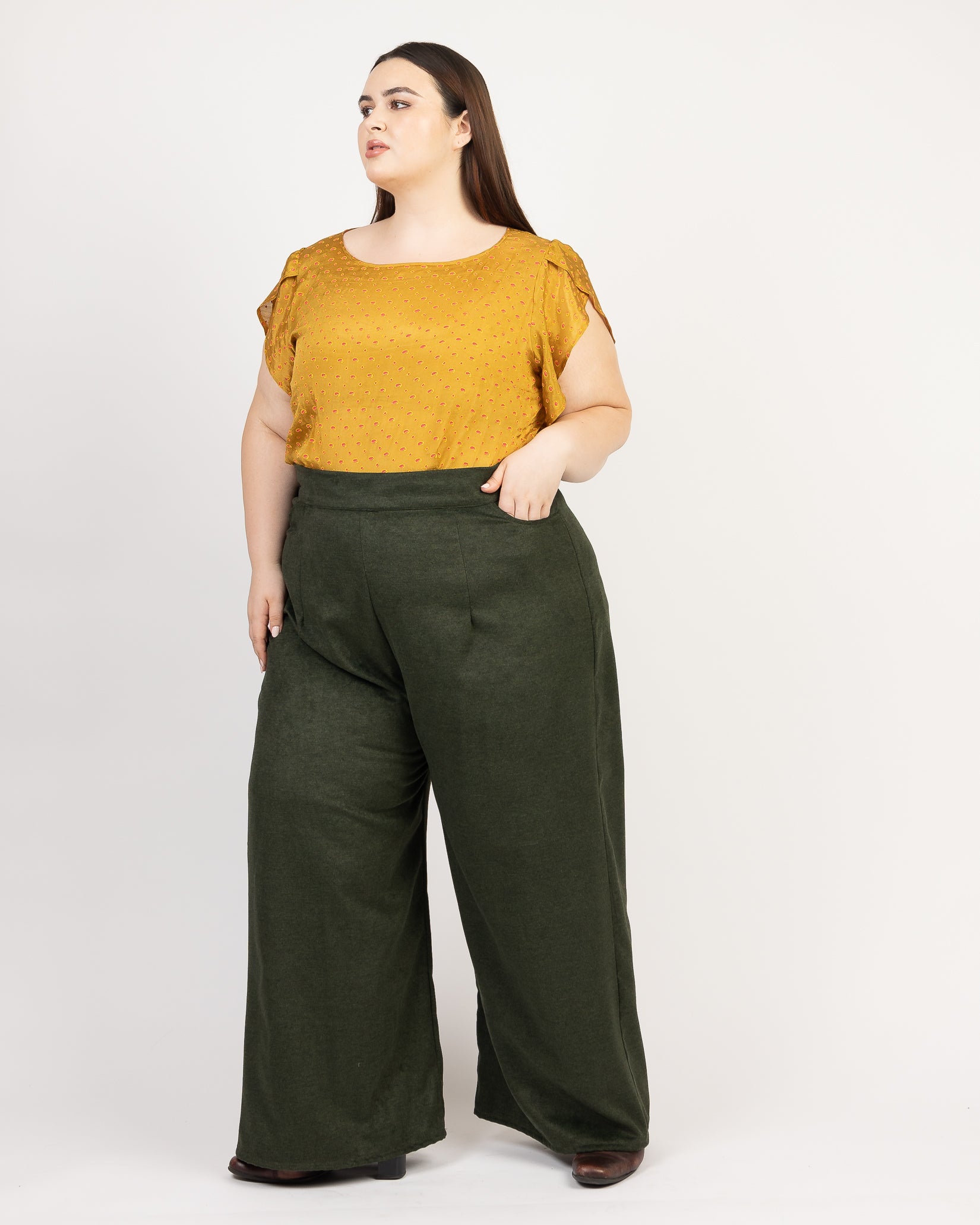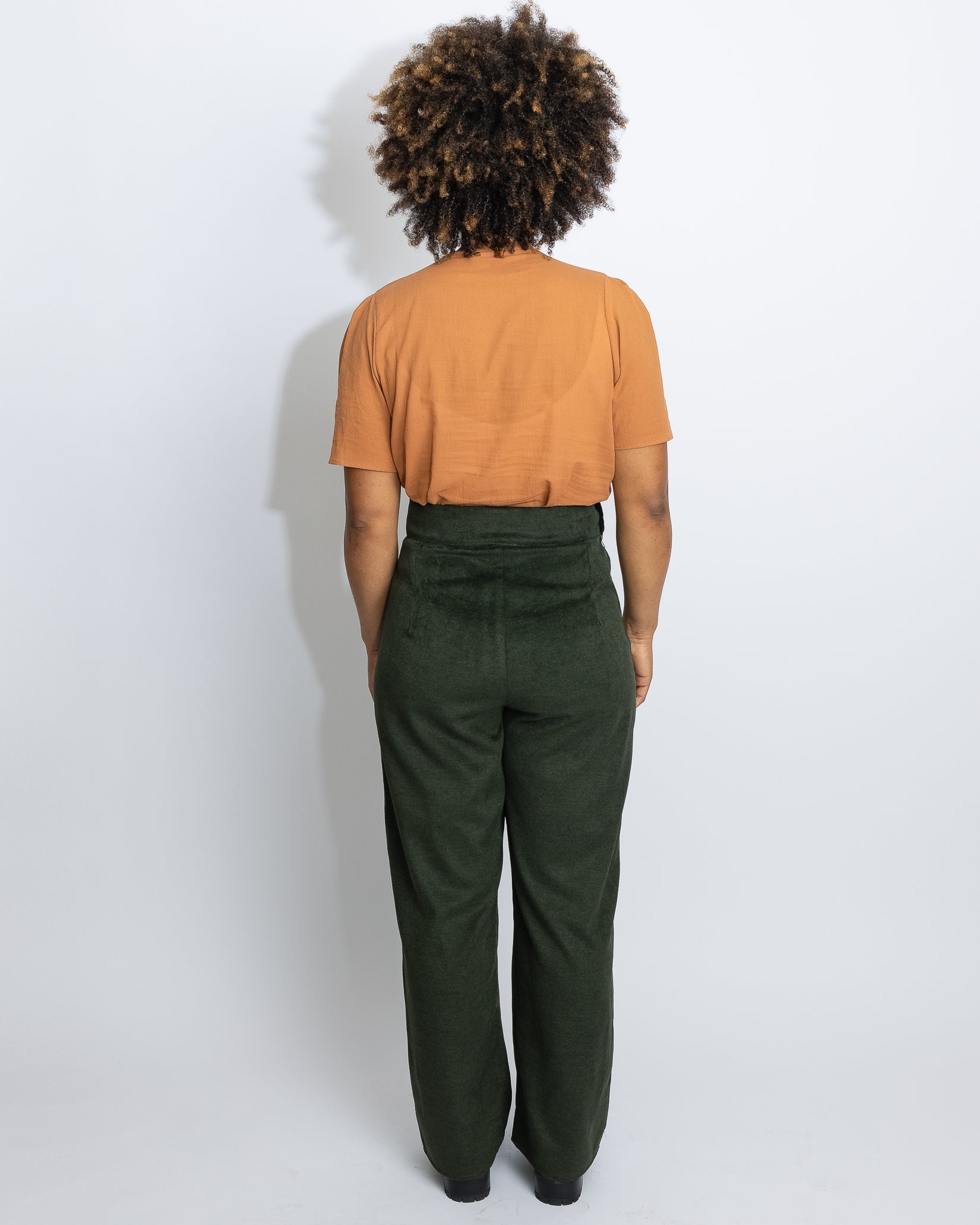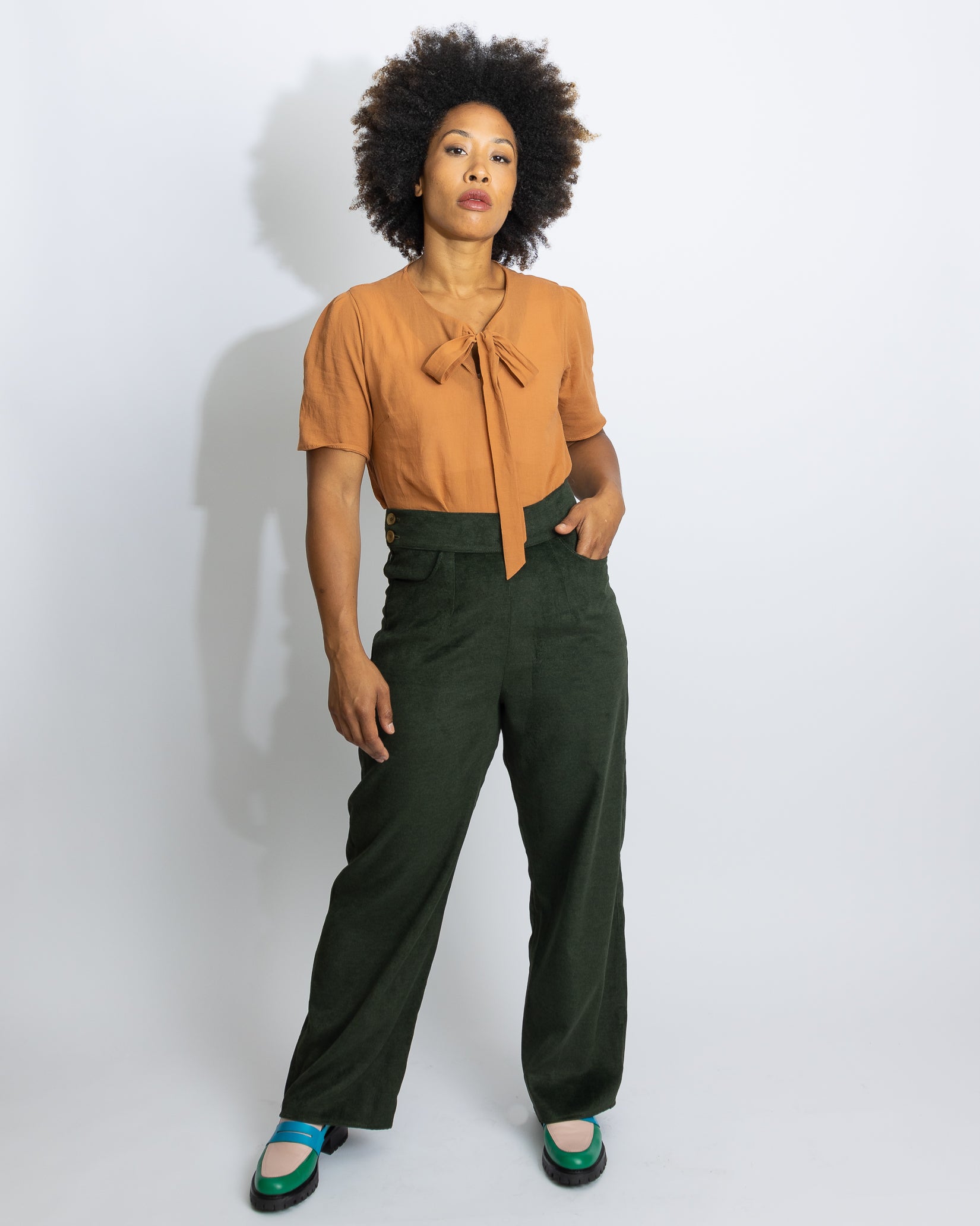 Kayiri mesure 5'7" et porte la taille 6 en Respect Velours olive avec Rock Lobster Cumin en Petit.
