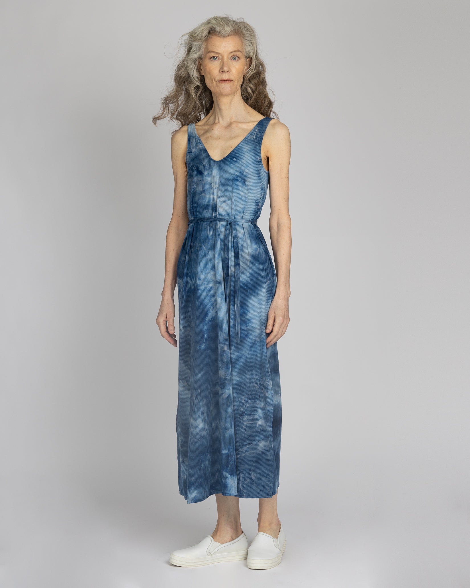 Ingunn mesure 5’7” et porte Sliver Midi Tie dye bleu en T-Petit.