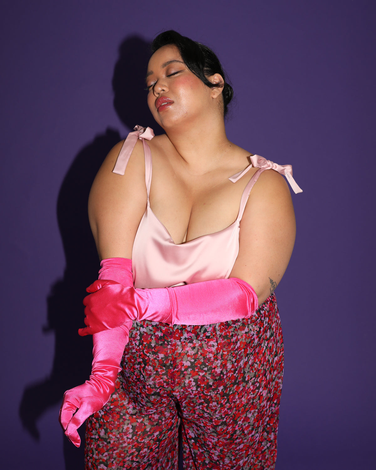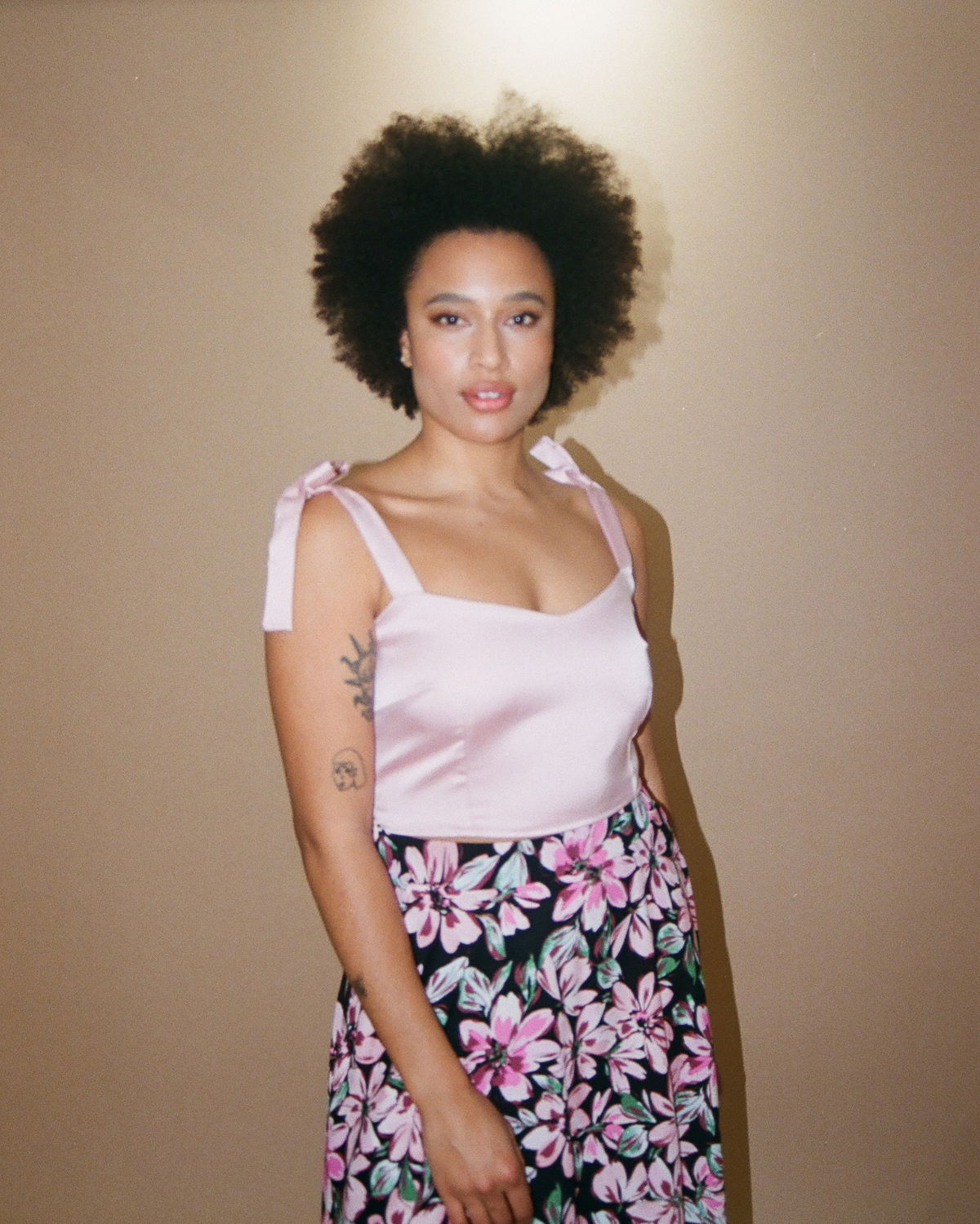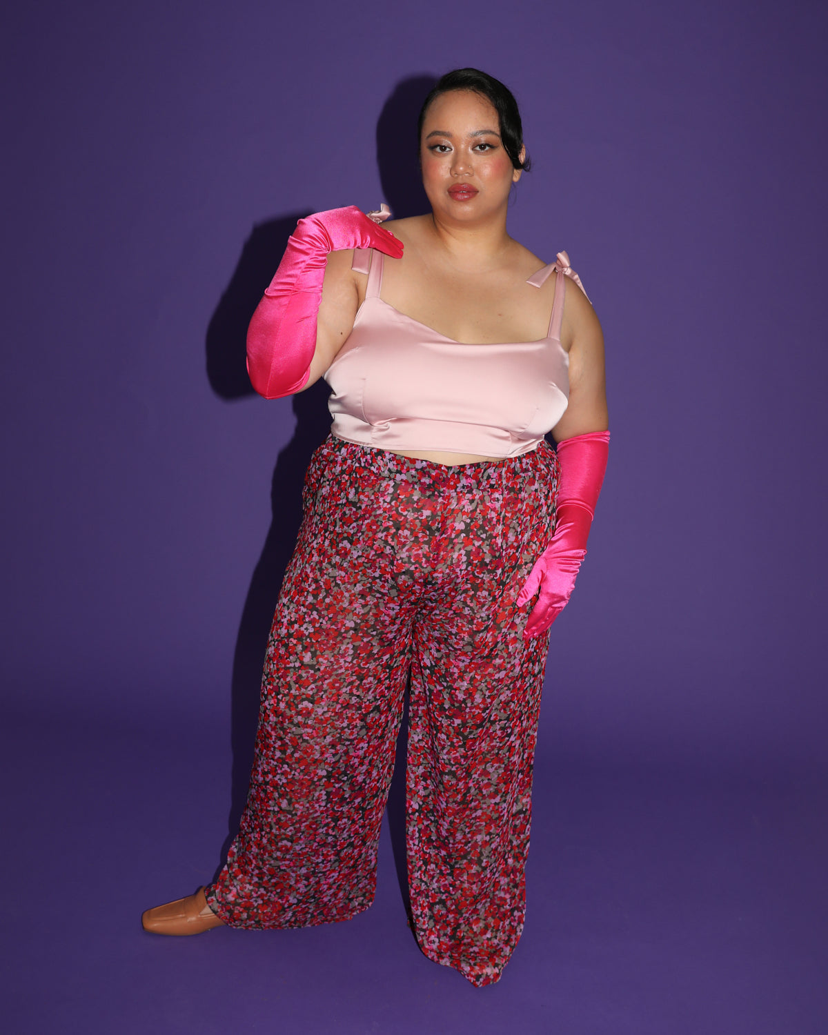 Miambi is wearing 1999 in pink in size 4 with New Wave in Floral in size S.