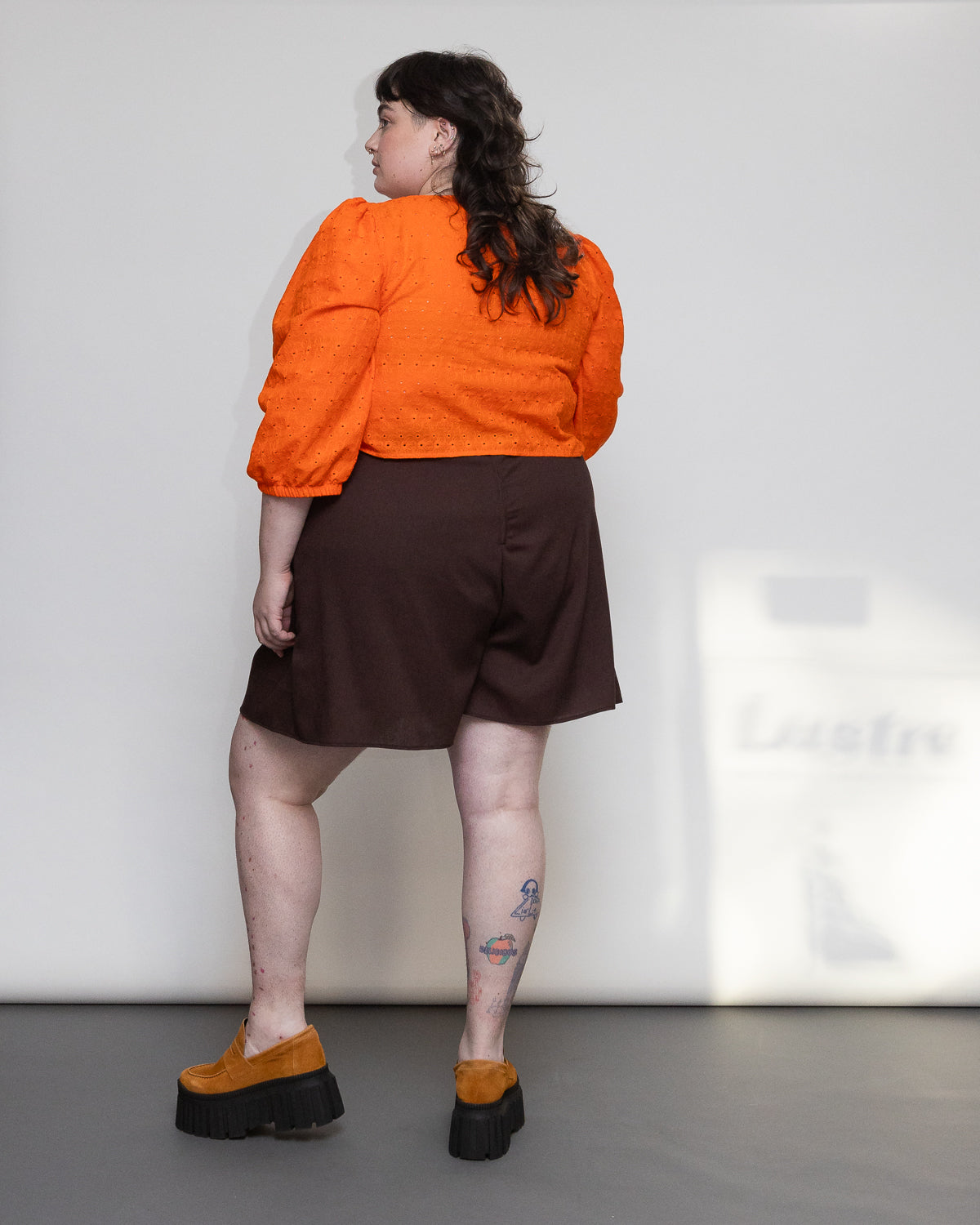 Jay is wearing Big Lies in Brown in size 22 with Naked eye in Tangerine in size 3XL.