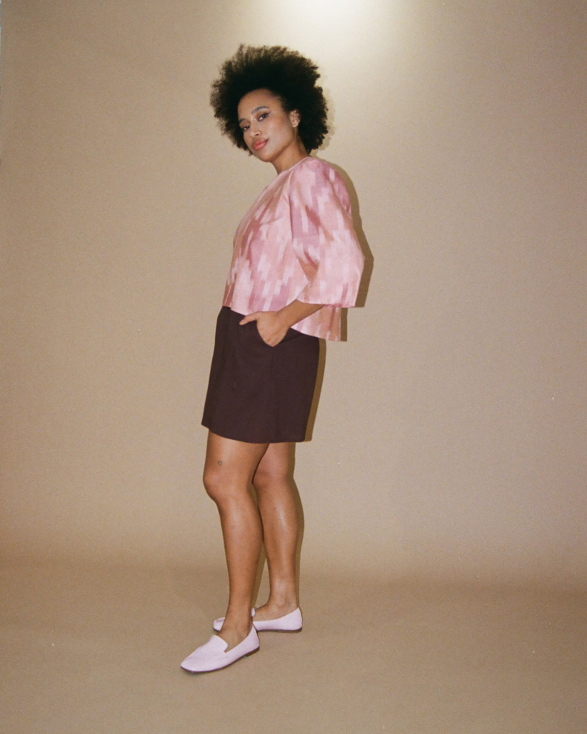 Miambi is wearing Shimmer in Pink in size XS with Big Lies in Brown in size 6.
