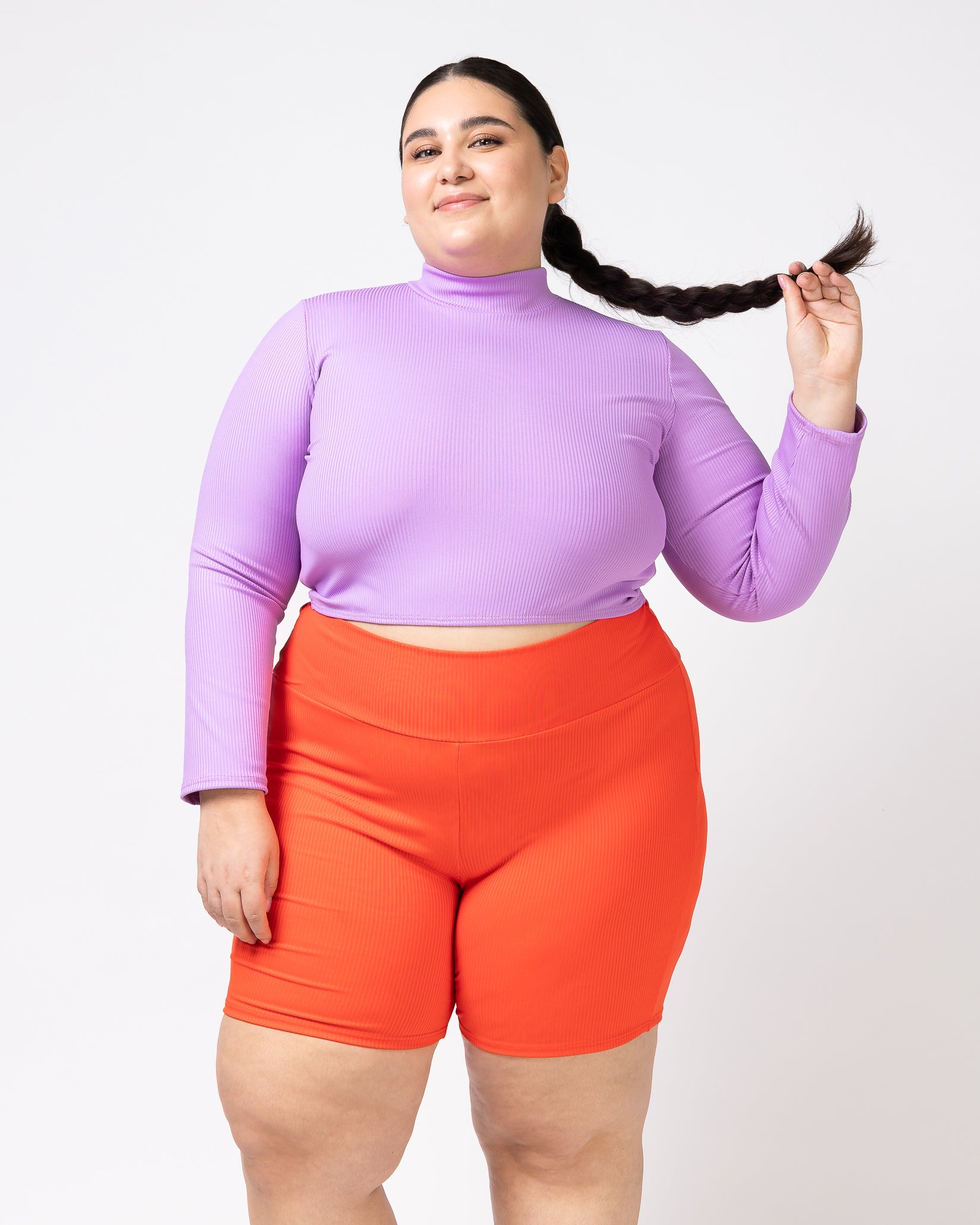 Gabriella is wearing Primitive Love in size 2XL in Violet with Bicycle Short in size 2XL in Cherry Tomato. For more support in the top she could be wearing an XL.